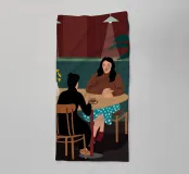 Un'illustrazione intima che cattura un momento di tranquillità tra due persone sedute a un tavolino di un bar. L'illuminazione calda e tenue e la loro interazione concentrata creano un racconto di conversazione e connessione, rappresentativo della vita sociale moderna.