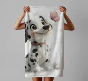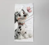 Un simpatico cucciolo di dalmata gioca felice in un prato fiorito, circondato da una farfalla e da fiori in un'incantevole illustrazione ad acquerello.