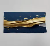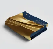 Una composizione astratta che mostra onde dinamiche di oro e argento, intrecciate con spruzzi vibranti su uno sfondo blu profondo, ideale per sfondi desktop e sfondi artistici.