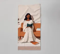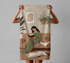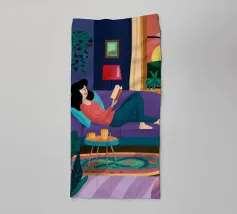 Una donna si accoccola su un divano verde, immersa in un libro e con una tazza di tè vicino. La stanza è decorata con piante e opere d'arte, creando una scena perfetta di confortevole solitudine e fuga intellettuale.