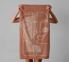 Questa opera d'arte presenta una serie di disegni al tratto di volti interconnessi su uno sfondo scuro. Le linee sono continue e creano un senso di unità e connessione.