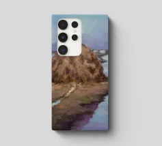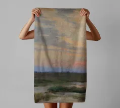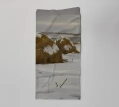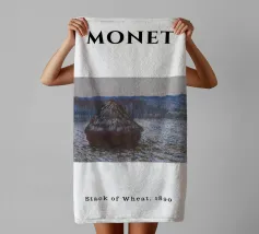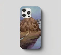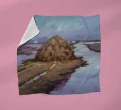 Un dipinto di paesaggio con un grande pagliaio in un campo vicino a un fiume o a uno specchio d'acqua tranquillo. Il cielo è di un grigio tenue e coperto, e la tavolozza generale è sobria con toni terrosi.