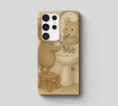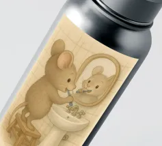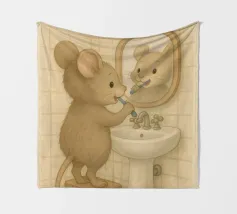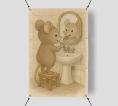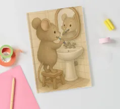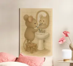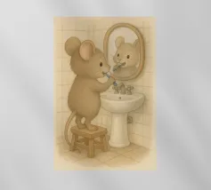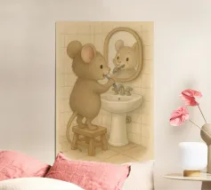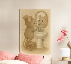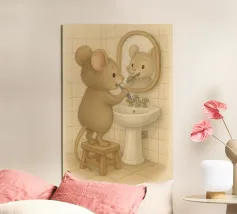 Un momento tranquillo e affettuoso, pieno di poesia quotidiana: questa delicata illustrazione mostra un topo che svolge la sua routine mattutina - concentrato, attento e con un dolce sorriso allo specchio. I toni caldi del beige e lo stile morbido dell'acquerello conferiscono all'immagine un'atmosfera rilassante, quasi fiabesca. Il motivo racconta la cura di sé, i piccoli rituali e la bellezza dei momenti meno appariscenti. Umoristico e calmo allo stesso tempo, invita a guardare alla propria vita quotidiana con maggiore serenità e gentilezza. Un'opera d'arte che si adatta particolarmente bene alle camere dei bambini.