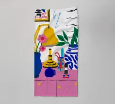 Una natura morta moderna ed eclettica con un paralume a scacchi, un vaso a zig zag e un fiore stilizzato. I motivi e le forme audaci creano una composizione divertente, grafica e di grande stile.