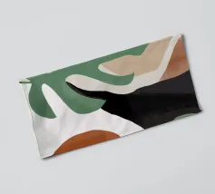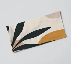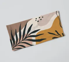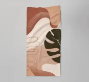 L'immagine presenta un'illustrazione astratta con una grande foglia di monstera nera e il contorno di una mano. Lo sfondo è costituito da forme morbide e fluide nei toni del beige e del marrone, che creano un'atmosfera armoniosa e organica.