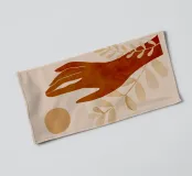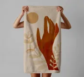 Illustrazione minimalista dai toni caldi della terra. Una mano stilizzata si protende verso il sole, mentre le foglie morbide sullo sfondo aggiungono un senso di equilibrio e natura. L'opera d'arte trasmette semplicità, serenità e una tranquilla connessione con il mondo naturale.