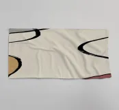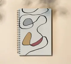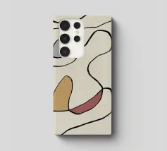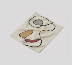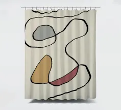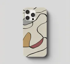 Una composizione astratta caratterizzata da linee nere fluide che formano forme irregolari riempite da colori tenui come il grigio, il marrone e il rosso. Lo sfondo è di un morbido colore bianco sporco che esalta la semplicità e l'eleganza del disegno.