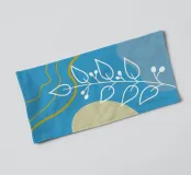 Un disegno botanico minimalista presenta un ramo bianco delineato con foglie. Linee curve e forme organiche nei toni del blu, del verde e del giallo creano uno sfondo moderno e astratto.