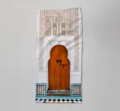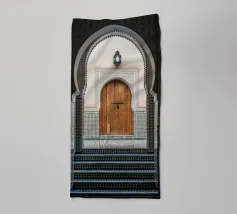 Architettura marocchina a Marrakech. Porta marrone con decorazioni intagliate e piastrelle colorate in nero, verde, arancio e blu.