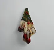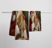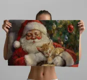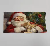 Un'immagine natalizia che scalda il cuore e che infonde sicurezza: Babbo Natale siede rilassato davanti all'albero decorato a festa e tiene in braccio un gattino che dorme pacificamente. I colori tenui e la luce calda conferiscono alla scena una calma magica, simbolo dell'amore, della pace e della tranquilla gioia del periodo natalizio.