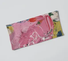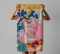 Un patchwork di motivi diversi, tra cui linee e forme a U, nei vivaci colori giallo, blu, rosa e rosso, crea un colorato effetto mosaico in questo pezzo astratto.