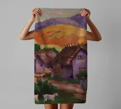 Un pittoresco paesaggio autunnale che raffigura un villaggio o una fattoria adagiata su una collina, circondata da un mosaico di alberi colorati nei toni dell'arancione e del giallo e da campi coltivati, con le lontane montagne blu a completare la scena.
