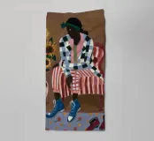 Questa opera d'arte mostra una persona seduta su una sedia a righe, circondata da girasoli e da una borsa verde. Lo sfondo è di un marrone tenue che crea un'atmosfera rustica e riflessiva.