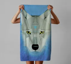 Un lupo bianco sembra emergere da una nuvola di nebbia su un suggestivo sfondo blu. La raffigurazione del lupo è morbida ed eterea, con i suoi dettagli che sfumano delicatamente nel vapore circostante.