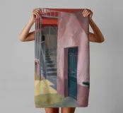 Una complessa scena urbana è resa con un'attenzione particolare alle forme geometriche e a un'audace tavolozza di colori rosa, verde acqua e rosso. Una scala esterna fornisce un forte elemento compositivo, guidando l'occhio attraverso le forme architettoniche astratte.