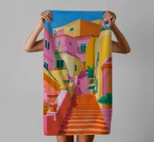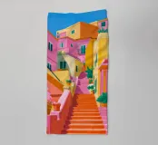 Una vivace scena di strada con edifici colorati e una scalinata rosa acceso che sale verso l'alto, evocando una vivace città costiera mediterranea o italiana.