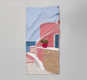 Una classica scena mediterranea che raffigura un edificio rosa con una scala che scende verso un tranquillo mare blu. Quest'opera d'arte cattura perfettamente il fascino solare e pacifico di un'isola greca.
