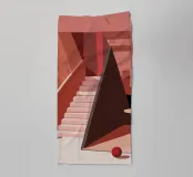 Un'imponente scalinata domina uno spazio interno reso interamente in toni di rosa, salmone e terracotta, creando una scena calda, monocromatica e lunatica.