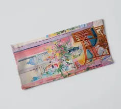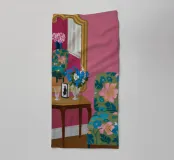 Una scena d'interni con una poltrona vuota rivestita con un motivo chintz floreale, riflessa in un grande specchio. La stanza è dipinta nei toni del rosa e del rosso, creando un'atmosfera calda, accogliente e leggermente nostalgica.