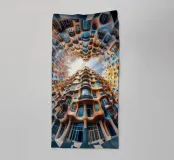 Una vista mozzafiato di una struttura architettonica circolare caratterizzata da motivi organici e fluenti e da tonalità vivaci. Il design unico fonde creatività e innovazione, offrendo un'esperienza visiva surreale con dettagli intricati e un luminoso cielo aperto.