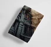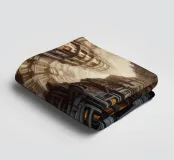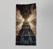 Una rappresentazione surreale di strutture architettoniche simmetriche e torreggianti che convergono verso una luce centrale incandescente. I disegni intricati, l'illuminazione calda e la prospettiva drammatica creano un'immagine impressionante e ultraterrena.