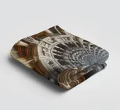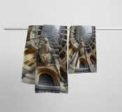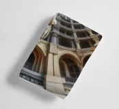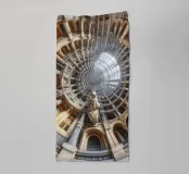 Questa immagine mostra un'intricata architettura circolare con colonne di pietra ornate, una statua centrale e un soffitto di vetro. La prospettiva surreale crea un effetto tunnel, attirando lo sguardo verso il centro della composizione.