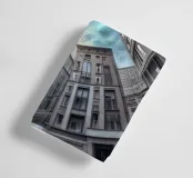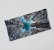 Questa immagine raffigura un'impressionante disposizione architettonica circolare con alti edifici classici modernizzati che convergono verso il cielo. Una statua prominente al centro esalta la prospettiva drammatica sotto un cielo azzurro e nuvoloso.