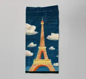 L'immagine mostra la Torre Eiffel in un cielo notturno di un blu intenso, con nuvole bianche, stelle scintillanti e una mezzaluna arancione. La torre stessa risplende nei toni caldi del giallo e dell'arancione e si staglia radiosa sullo sfondo scuro. Lo stile è chiaramente illustrativo e artistico, un misto di romanticismo sognante e colorazione espressiva. Ricorda un dipinto o un poster digitale che enfatizza l'atmosfera e lo stato d'animo piuttosto che la precisione realistica. Un gioco visivamente affascinante tra fantasia e punto di riferimento.