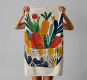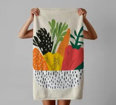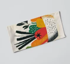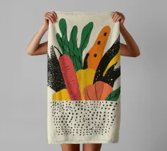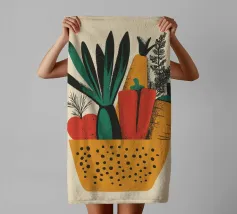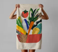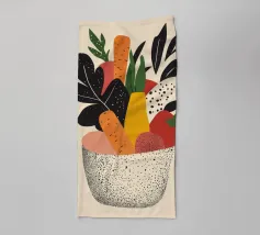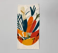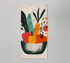 Un omaggio stilizzato alle meraviglie dell'orto. Con le sue tonalità calde e le texture audaci, questa illustrazione grafica sublima le forme e i colori degli ortaggi con una modernità abbagliante.