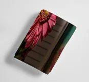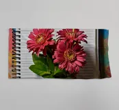Un taccuino rilegato a spirale presenta tre fiori rosa e foglie verdi, disposti su una superficie di legno colorato, che invitano alla creatività e all'ispirazione.