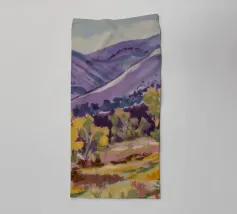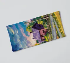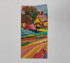 Un dipinto espressionista di una strada di paese, caratterizzata da case dai colori vivaci nei toni del verde, del blu e del bianco, con una suggestiva strada viola che conduce lo sguardo, il tutto sotto un cielo luminoso ed energico.
