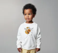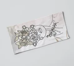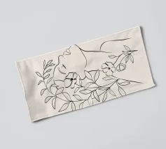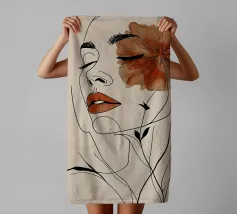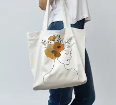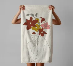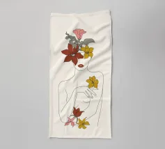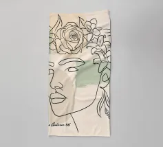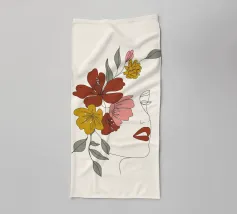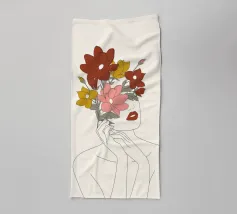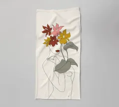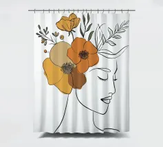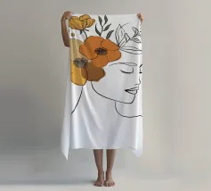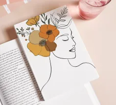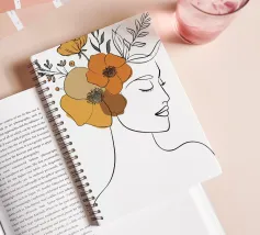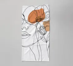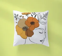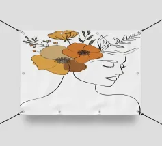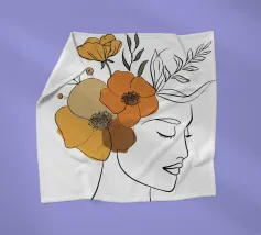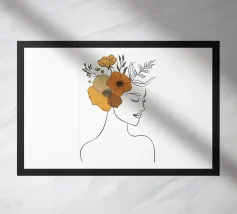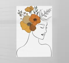 Un disegno al tratto minimalista raffigura il profilo di una donna dall'espressione serena. I suoi capelli sono ornati da grandi fiori stilizzati di colore arancione e giallo e da foglie delicate.