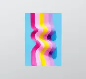 Quadro astratto con strisce ondulate rosa, gialle e blu su sfondo piatto. Ispirato a Hockney, reso realistico con colori pastello e una messa a fuoco nitida. Motivo d'arte moderna per un design d'interni elegante.