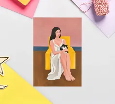 Marta ha portato una ciambella gialla nell'oceano e l'ha dichiarata nazione sovrana. Per tre ore beate ha governato con occhiali da sole oversize e un costume da bagno a righe che aveva visto più festival estivi di una pop star in pensione. Nessuna persona, nessun rumore, solo gabbiani educati e un'eccellente galleggiabilità. Quadro originale di una donna solitaria che galleggia su una ciambella giallo brillante in un mare vasto, calmo e verde acqua. Il costume da bagno a righe vintage, l'ampio cappello da sole e gli occhiali da sole rotondi conferiscono alla donna un'atmosfera retro e giocosa, mentre l'abbondante spazio negativo e la texture morbida creano una composizione calma e ariosa.