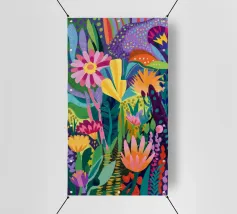Una fusione di campi geometrici e schizzi botanici crea una giungla trapuntata di serenità selvaggia.