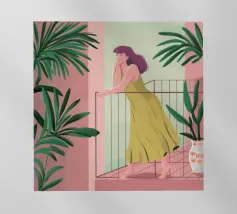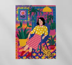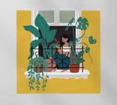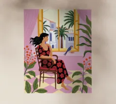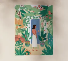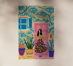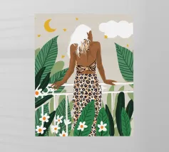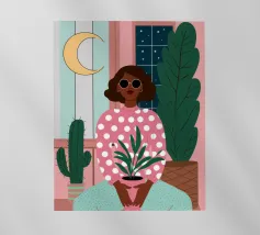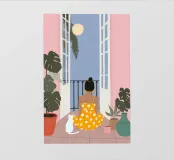 Una tranquilla scena serale di una donna e del suo gatto seduti accanto a una porta aperta, circondati da piante rigogliose e dalla tenue luce della luna. La composizione delicata è sognante e femminile, con linee pulite e calma pastello. Realizzata per portare un po' di silenzio e di energia lenta nella vostra giornata.