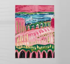 Un patchwork di motivi diversi, tra cui linee e forme a U, nei vivaci colori giallo, blu, rosa e rosso, crea un colorato effetto mosaico in questo pezzo astratto.