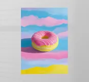 Ciambella giallo-rosa con glassa bianca galleggia davanti a un cielo blu pastello con nuvole rosa. Composizione giocosa con effetto movimento, colori vivaci e stile fantasioso. Perfetta per decorazioni moderne, fotografia di prodotto o spazi creativi.