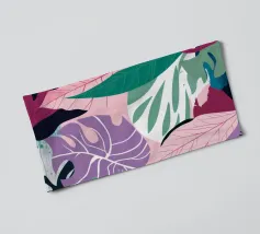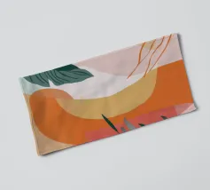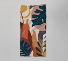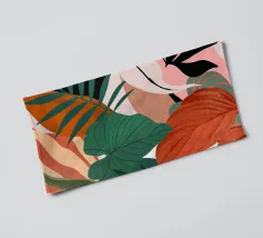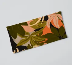 Una composizione elegante e lunatica di foglie tropicali scure e sovrapposte con tocchi di arancione e bianco, che creano un sofisticato e drammatico gioco di ombre e luci.