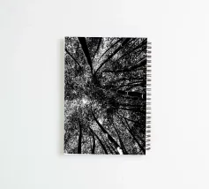 Black and white view from below of a forest of very tall trees.