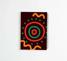 Un audace disegno astratto è caratterizzato da cerchi concentrici rossi e verdi, circondati da punti verdi. Due linee arancioni ondulate aggiungono un movimento dinamico alla composizione.