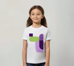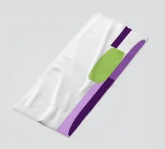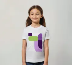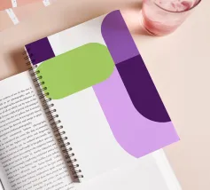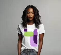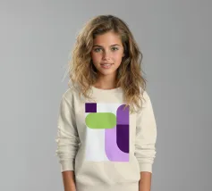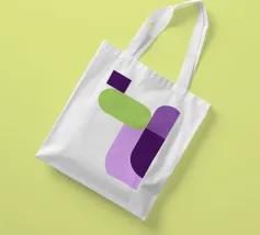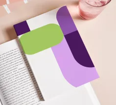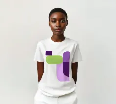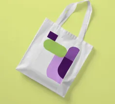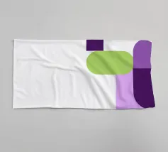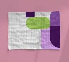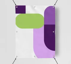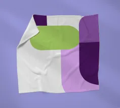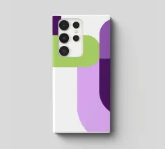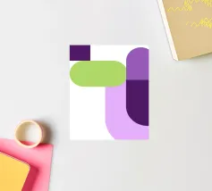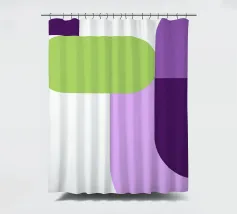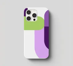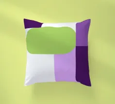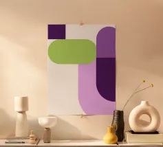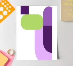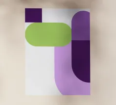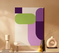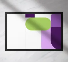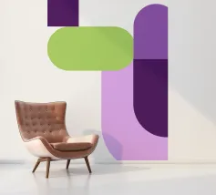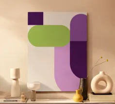 Forme geometriche in viola, lavanda e verde sono disposte in un design minimalista. La composizione crea un aspetto moderno e astratto con blocchi di colore audaci che si intersecano in vari angoli.