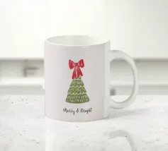 Disegno di un pino verde con neve e un fiocco rosso con citazione di Natale