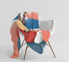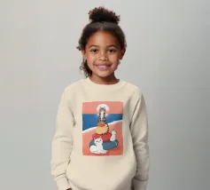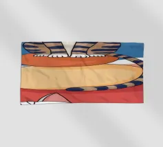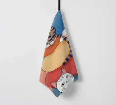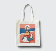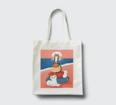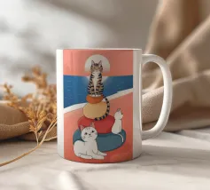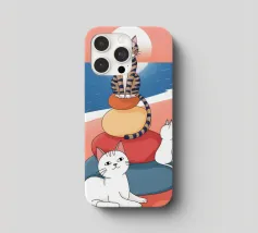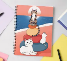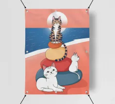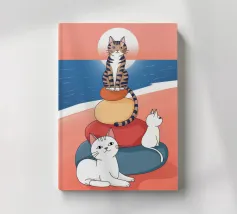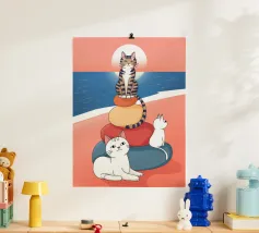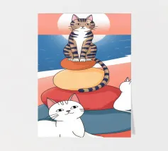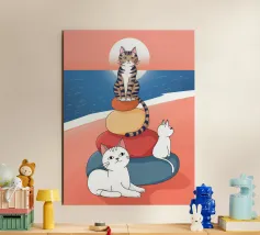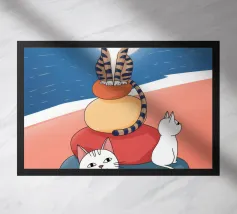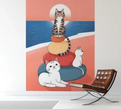 Un'ambientazione serena sulla spiaggia presenta un gatto seduto su cuscini impilati insieme ad altri due gatti, tutti intenti a guardare il tramonto. Le tonalità tenui e l'atmosfera pacifica evocano tranquillità e unione.