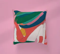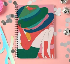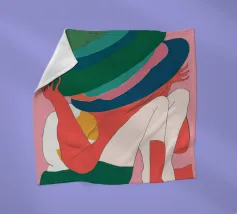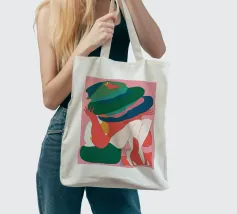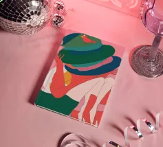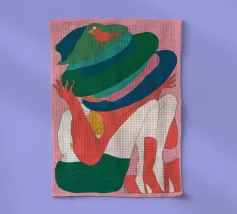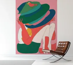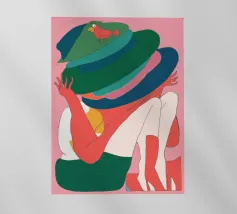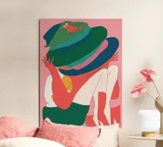 Un ritratto astratto di una donna il cui volto è oscurato da un grande cappello verde e da abiti colorati, che creano un'aura di mistero e intrigo elegante.
