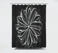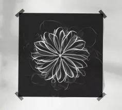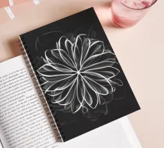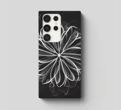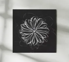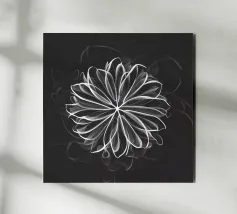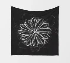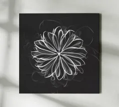 Un fiore ipnotico ed etereo si dispiega su uno sfondo nero profondo, irradiando un bagliore ultraterreno. I suoi petali intricati e le sue linee delicate evocano un senso di bellezza cosmica e di tranquillità.
