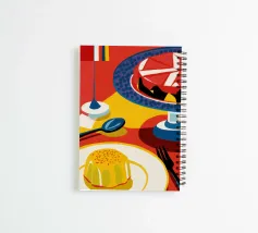 Vista dall'alto di una scena di ristorazione moderna con un flan o un creme caramel e una fetta di torta alla frutta su uno sfondo colorato e suddiviso in sezioni.
