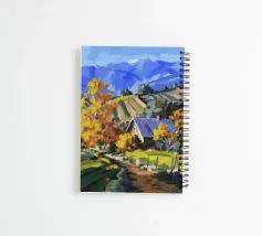 A picturesque autumn landscape depicting a village or farm nestled on a hillside, surrounded by a patchwork of colorful trees in shades of orange and yellow, and cultivated fields, with distant blue mountains completing the scene.
