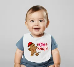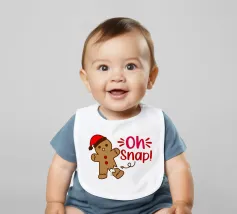 Un allegro personaggio di pan di zenzero che indossa un cappello e una sciarpa da Babbo Natale è affiancato dalla scherzosa frase "OH SNAP" in lettere rosse.