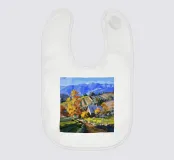 Un pittoresco paesaggio autunnale che raffigura un villaggio o una fattoria adagiata su una collina, circondata da un mosaico di alberi colorati nei toni dell'arancione e del giallo e da campi coltivati, con le lontane montagne blu a completare la scena.